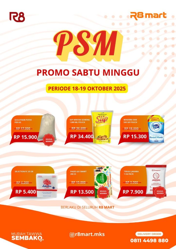 Akhir pekan ini waktunya belanja cerdas dan hemat! Dalam program Promo Sabtu Minggu (PSM), R8 Mart kembali menghadirkan penawaran spesial untuk pelanggan setianya pada 18–19 Oktober 2025.